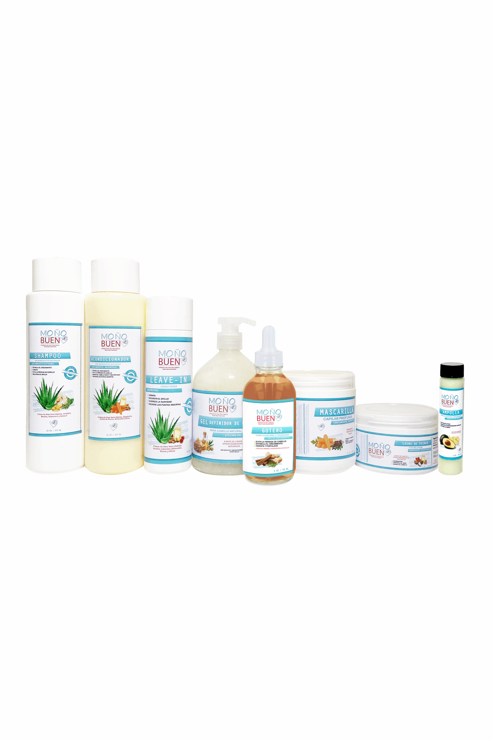 Componentes. Shampoo 16 oz. Acondicionador 16 oz. Mascarilla 16 oz. Leave-in 8 oz. Gotero 4 oz. Gel de rizos 16 oz. Crema de peinar 8 oz. Ampolla 1 oz GRATIS.